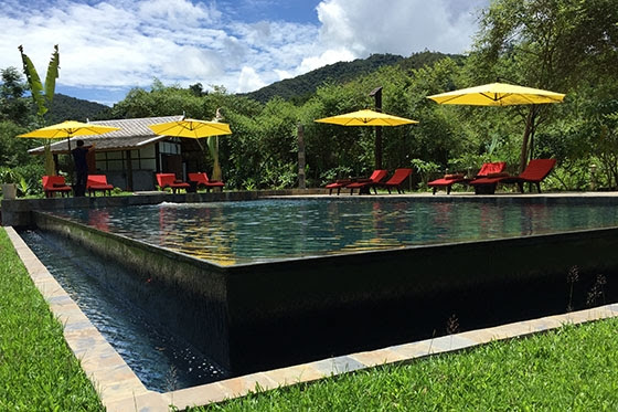 The resort is surrounded by two natural hot bathing springs and has recently added the overflowing infinity pool, built onto a small, private island, set into the middle of a flowing river. The island is only 5,000sqm in size and is connected to the Muang La Resort by bridge. The 15x6m river-island swimming pool uses filtered water from the river.