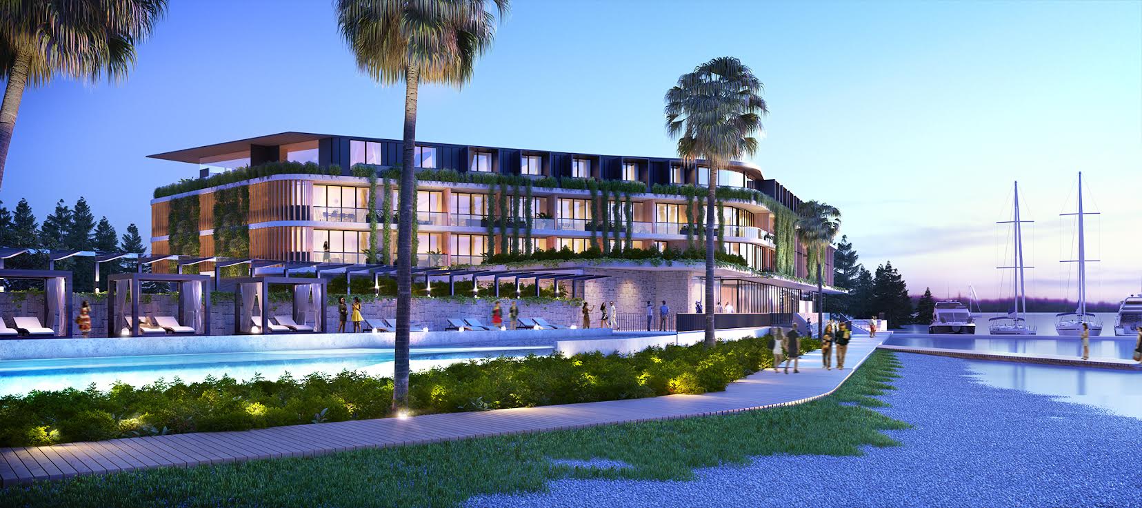 The Resort will comprise of 65 hotel rooms as well as 150 one-, two- and three-bedroom serviced apartments and feature a business centre, 300 person conference/wedding facilities, a swimming pool, day spa, gymnasium, restaurant and bar, executive lounge, tourist information office and ground level retail outlets. Some of the hotel rooms will feature premium views overlooking Lake Macquarie and a proposed 188-berth marina.