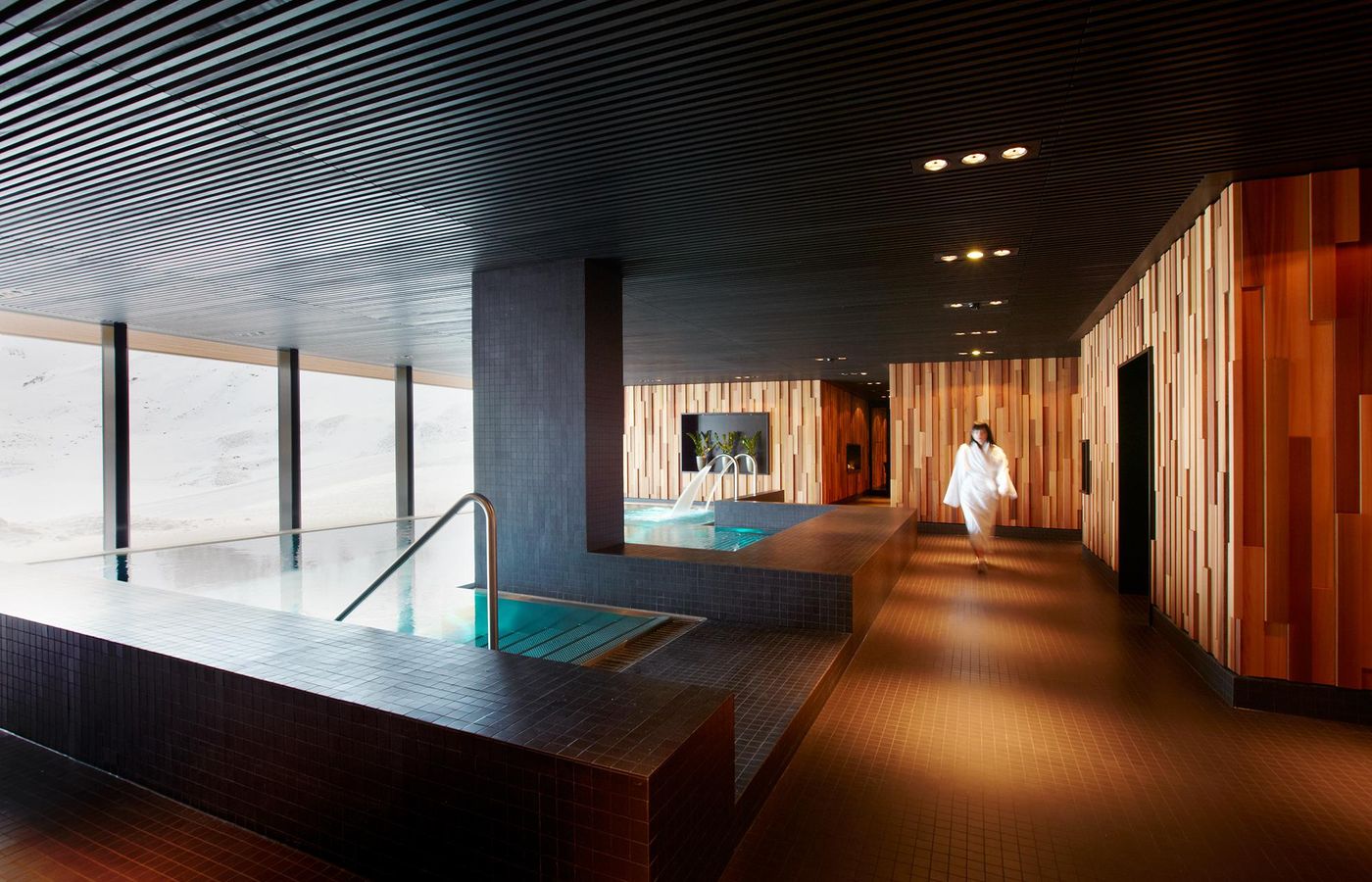 Situated in the basement, the spa is the high point of the building’s expressionist design. A succession of chambers simulates the experience of bathing in a cave system. The way the rooms are connected and the overhead lighting are reminiscent of a hammam; the stark geometric planes and angles give the space a futuristic feel. In the spa, the single-lever washbasin mixers of the Axor Starck V collection combine minimalist aesthetics with resource-saving EcoSmart technology. A raised and open-ended glass spout with a 360-degree swivel range makes it possible to see and experience the natural power and vitality of a water vortex. The mixer, designed by Philipp Starck, is made of crystal glass and chrome with a brushed gold finish, a special surface finish supplied by the Axor Manufaktur. The same warm gold finish was used on the concealed shower valves of the Axor Citterio collection with their well-known characteristic cross handles. Accessories of the Axor Citterio and Axor Uno ranges give the bathrooms a finishing touch. Another gold highlight in the spa: the Axor LampShower designed by Nendo. The combination of overhead shower and ceiling lamp not only delivers a warm, extra wide rain spray, but it also bathes the user in a pleasant, warm light. There’s no better way to cap off a day of skiing, hiking or pampering.