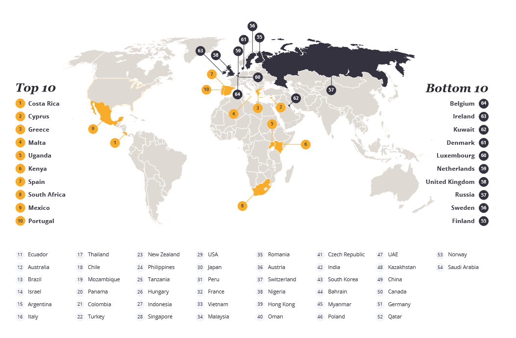 This culturally-rich country has good weather all year round, but it lags behind in several other categories. Personal safety is one of them, where 28 per cent of expats rate it bad or very bad. That is 23 percentage points less than the global average. In addition, the cost of living is also very high, with only three percent of the respondents rating it as very good.