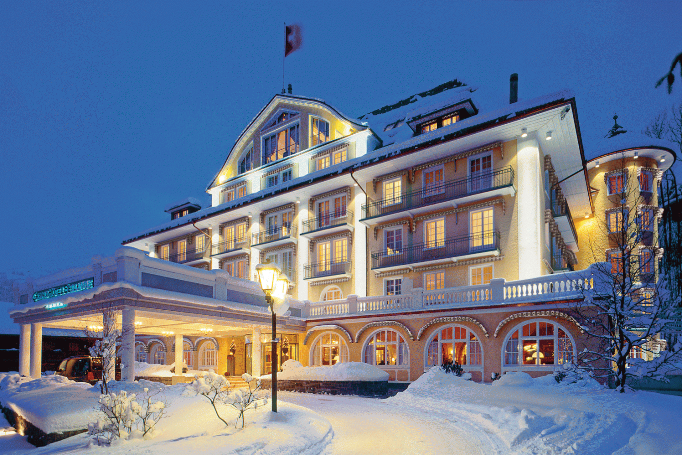 Le Grand Bellevue offers the Le Grand Party package from 2700 CHF for two people. This includes three nights in a deluxe chic room on a half board basis, plus entry to bouquet and a round of drinks, a recovery hamper including a Bamford weekender bag, alpine energy bars and drinks, and a spa treatment for each guest in Le Grand Spa. Available from 16 to 22 December, 6 January to 9 February and 26 February to 1 April.