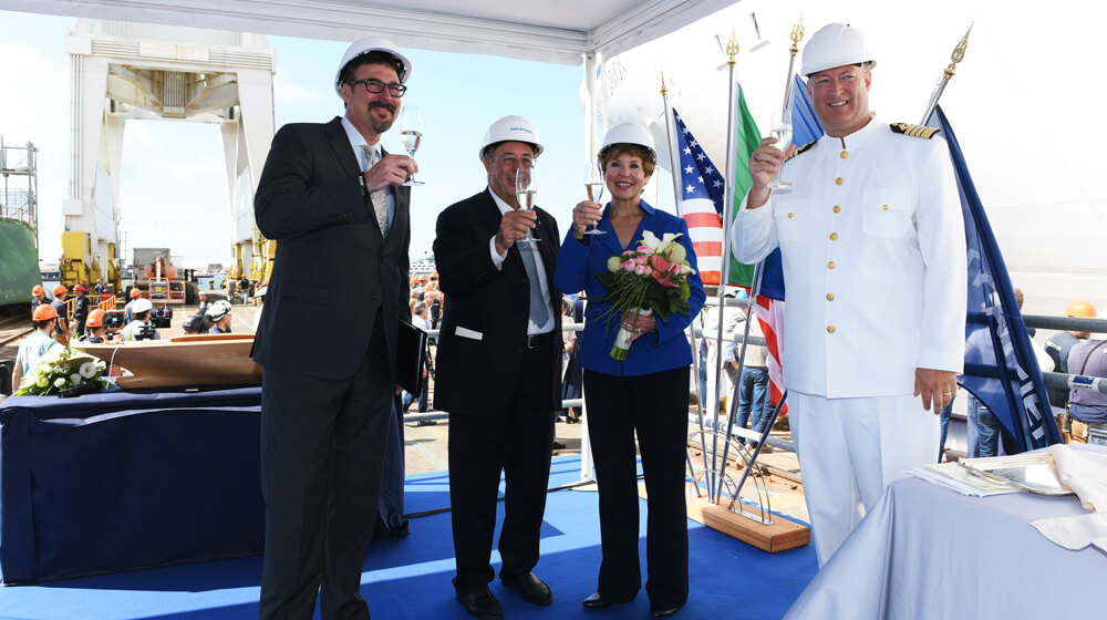 The time-honoured coin and launch ceremony is an enduring maritime tradition that calls for a “madrina” to preside over the celebratory events. Serving in this significant role was Jan Stearman, Seabourn’s longest-serving female shipboard team member, who joined the company 22 years ago, and a well-known and respected cruise director. Along with Seabourn President Richard Meadows, Fincantieri shipyard director Paolo Capobianco and Seabourn Ovation captain Stig Betten observed the welding of two commemorative gold coins to the ship’s mast. Stearman then cut the ship’s cord to allow water to flow into the ship’s building dock. The ship will be “floated out” from its dry dock and moved to its outfitting dock at the shipyard, where it will undergo final construction until the ship is delivered in 2018.