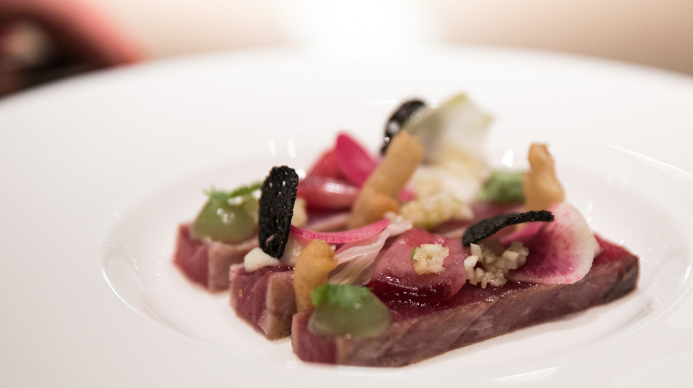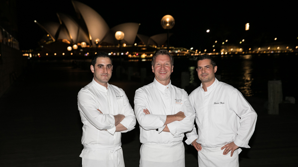 Throughout the evening, guests dined on Witz’s amuse bouche of vegetable jardinière and main of Rangers Valley Black Angus beef tenderloin with ravioli à la Monégasque, and Karner’s entrée of seared yellowfin tuna and tarte citron ‘surprise’, hidden in a white Valrhona chocolate dome (created with Shlomi Palensya).