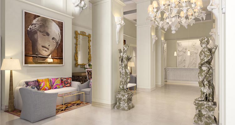 The Pucci accents of sofa cushions printed in a solid statement of black and fuchsia, velvet flower-printed armchairs and a hand-tufted rug featuring the iconic Lamborghini print from the Emilio Pucci archives merge Renaissance motifs with a pop-art spirit. Finishing in the terrace restaurant are the new Emilio Pucci silk scarves designed for Hotel Savoy, encased on the glass table tops. The hotel entrance and lobby have been reinstated to their original grandeur, with a 5-metre-high corniced ceiling and two new large reception desks which incorporate caryatid putti on the four corners, and the Fleur de Lis, the emblem of the city. The fluid white space is emphasised with colourful art and design elements, including paintings by Luca Pignatelli.
