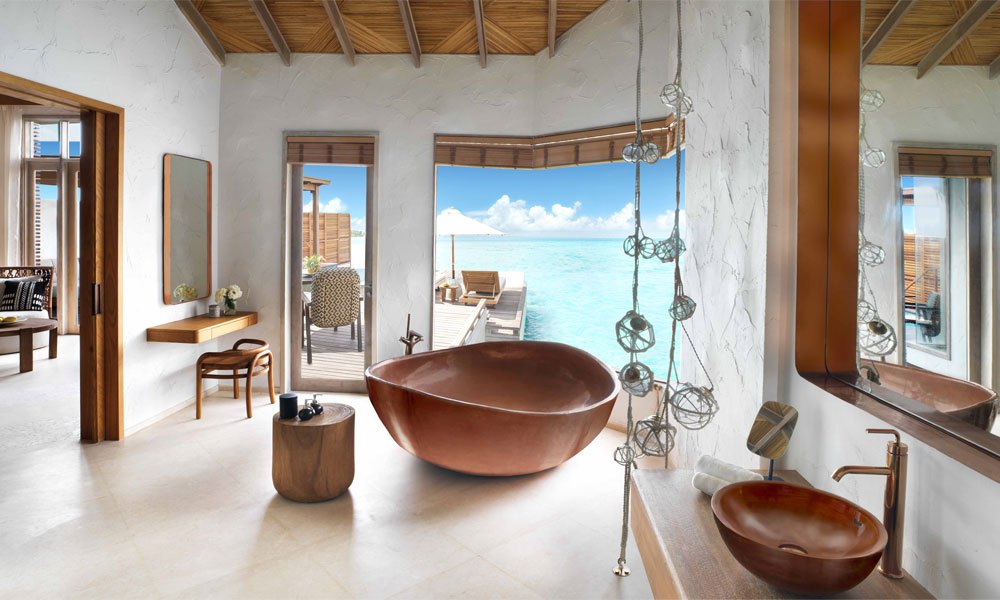 The 120 villas are categorised based on the island’s topography, and include Beach Villas, Water Villas, and Tented Jungle Villas. Copper bathroom fittings and carved wood detailing on furniture lend the villas a bohemian chic vibe. Specially adapted to the Maldives, the tented jungle villas offer privacy and a romantic castaway; while other guests can also experience the verdant island interiors with glamping barbecues or jungle cinema.