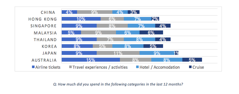 Millionaires are willing to spend on travel experiences and activities more than on luxury accommodation. Cruise travel is growing across Asia Pacific, particularly in Malaysia, South Korea and Australia, which show relatively higher spending on cruise travel.