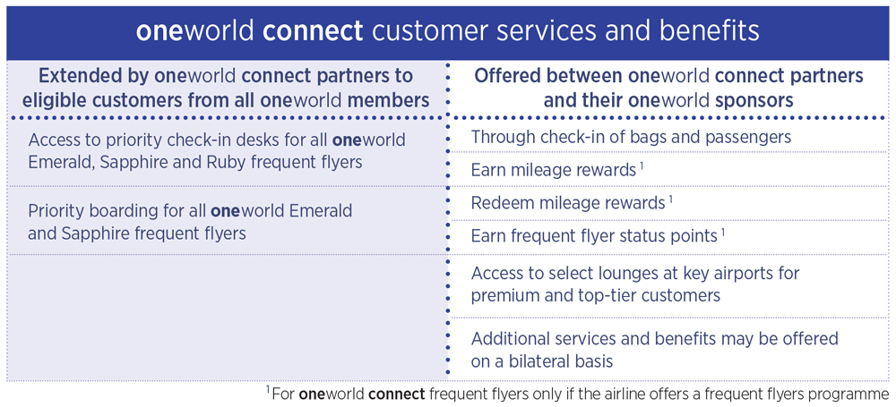 Select other customer benefits may also be offered between oneworld connect partners and their oneworld sponsor airlines.