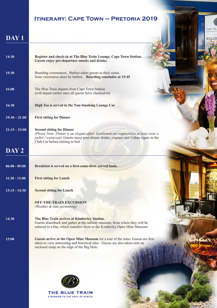 The Blue Train dress code will remain smart casual during the day, and formal for dinner, with men requested to wear a jacket or waistcoat, but no tie, and ladies elegant attire.