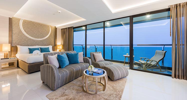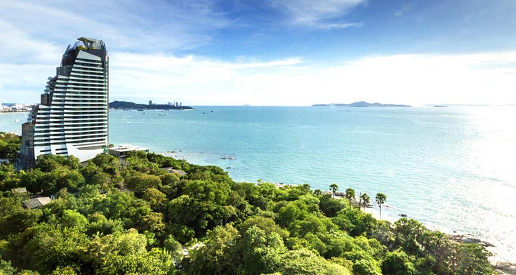 The striking contemporary resort, named for the nearby beach, is one of Thailand’s most eye-catching new luxury properties, set in an exclusive residential part of north Pattaya and surrounded by 0.75 hectares of landscaped gardens and private beach, with views to the islands offshore.