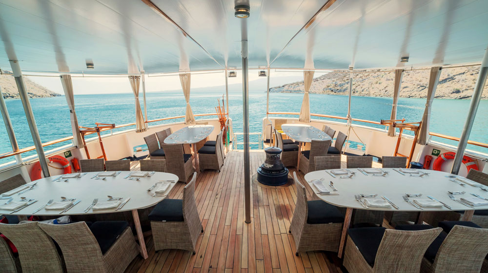Indoor dining is elegant and cozy. We try to do outdoor dining as much as possible, but beware when you are dining outdoors in the Galapagos. You will have interruptions. There’s a lot going on. You will drop your knife and fork and you’ll be off with your camera in a flash because a pod of orcas are swimming past.