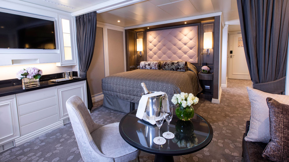 Seven Seas Splendor is an all-suite, all-balcony ship, offering up to 750 guests the most elegant accommodation. Guests will enjoy distinctive public spaces as well as 375 beautifully appointed suites ranging from the 28-square-metre Veranda Suite, to the lavish 413-square-metre Regent Suite. With a private in-suite spa with steam room, a custom heated spa on a private balcony, and ceramic-heated lounge beds, the Regent Suite also comes with a butler as well as a car and driver awaiting excursions in every port.