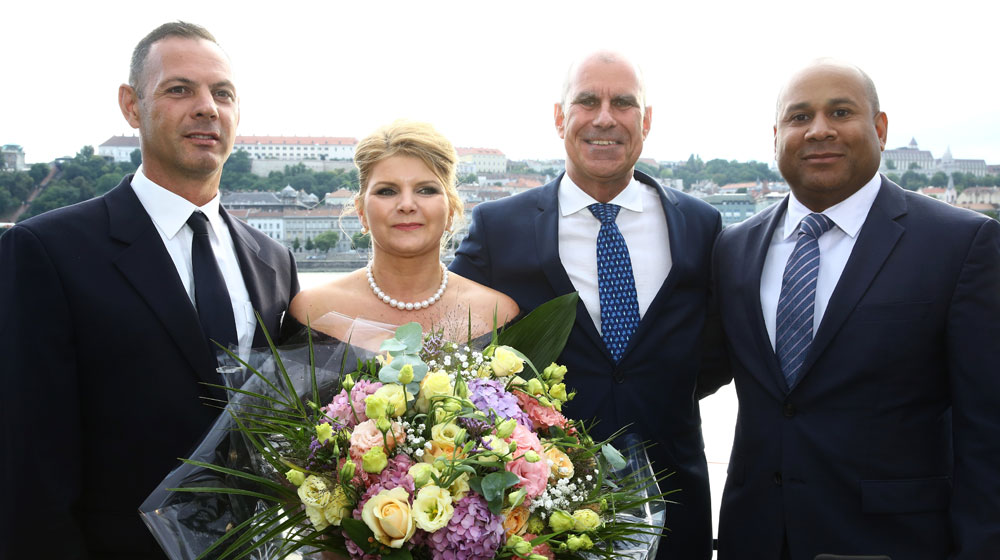 Crystal Ravel’s Captain Ferenc, Godmother Mariann Peller; Feren; President and CEO of Crystal River Cruises Tom Wolber and Vice President and Managing Director Walter Littlejohn.