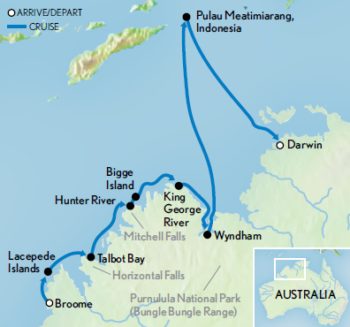 Departing Broome, the Kimberley Cruise: Australia’s Last Frontier itinerary sees clients discovering a vast, untouched wilderness of far-flung islands, stunning tidal waterfalls, bio-diverse coral reefs, riverine mangrove forests, historic Aboriginal sites, cavernous coastal gorges, towering mountain ranges and exotic wildlife. Wind down the expedition with a relaxing day at sea, disembarking in Darwin the following morning.