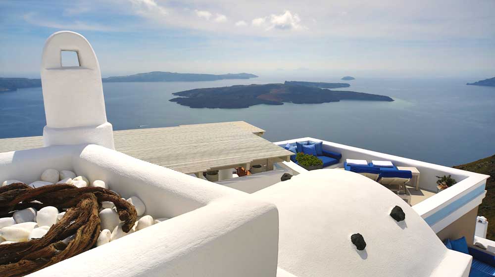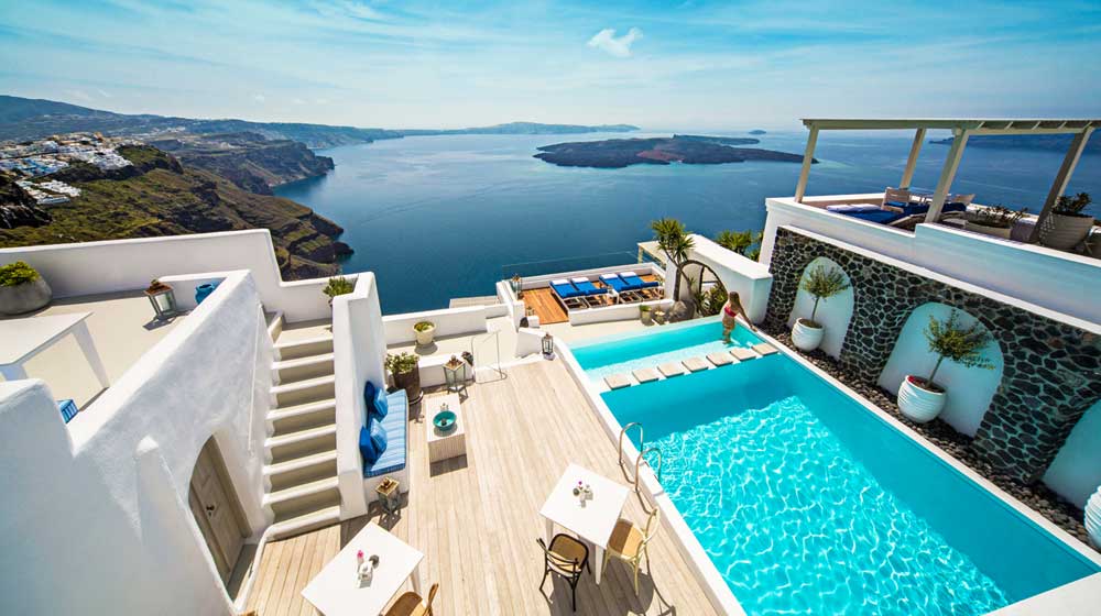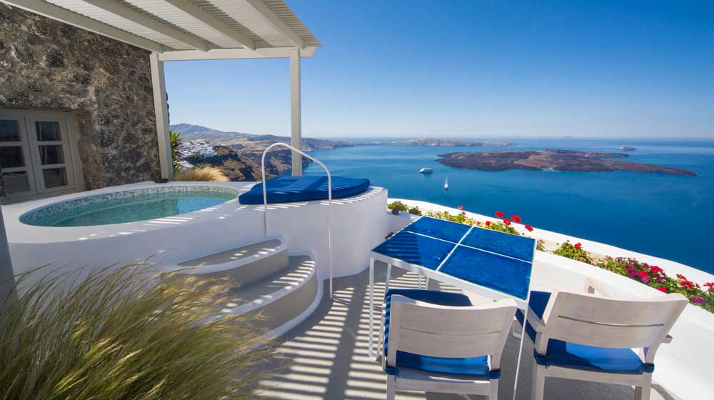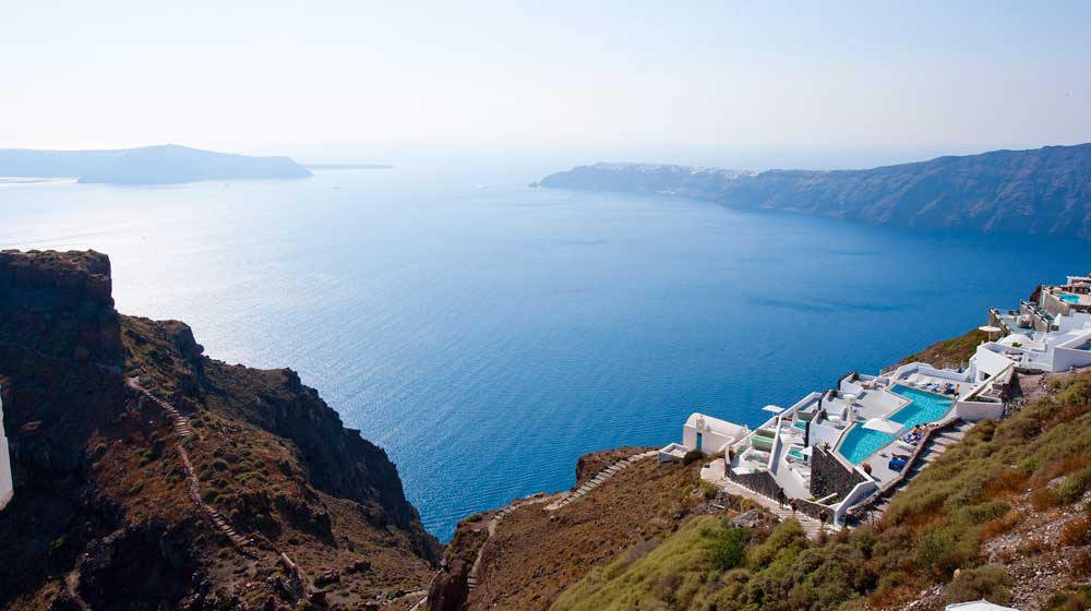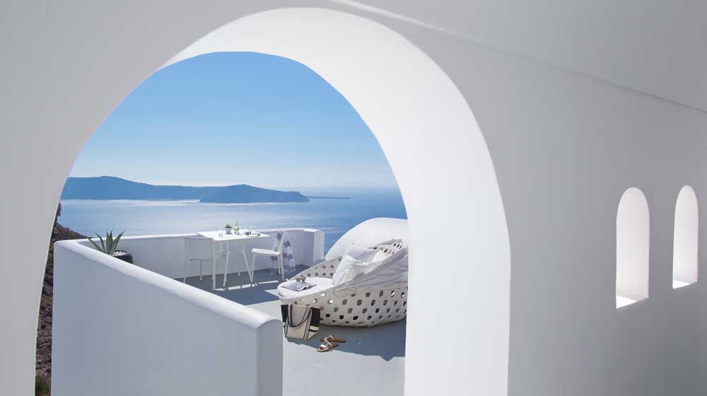 Santorini, named for St Irene, is one of Greece’s most popular islands, and from June to September hotels are jam-packed. The most exclusive are in Imerovigli, at 300 metres up, the highest point in this Cyclades island. Think of a 3D jigsaw and this is how hotels here are packed in, one bit of land protruding into its neighbour, but no one minds. To get to Iconic Santorini, for instance, after leaving the car there is a 10-minute walk up and down the twisting 1.2-metre-wide road, past the jewellery-boutique-like reception of Hotel Chromata, and, five minutes later, down past the open reception of On The Rocks. End of the road is the super-luxury Iconic Santorini.