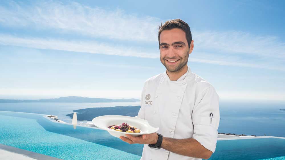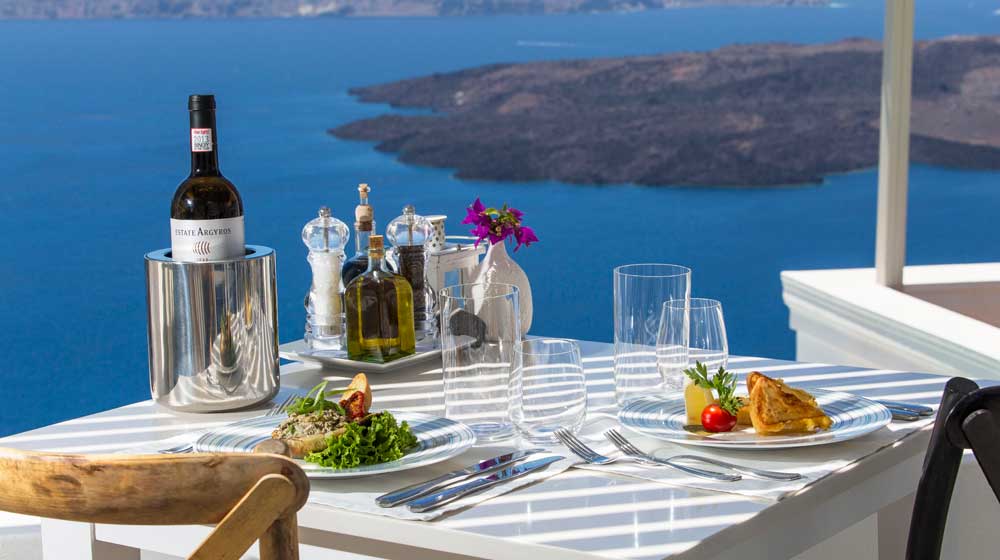 Mattheos Sorotos is so passionate. Now 27, he started cooking in high school. Local suppliers bring him what he needs, including just-caught fish. He buys in bread and yoghurt but little else. Generally, his dinner menus run to a rough 14-night cycle while breakfast, which is usually a composed multi-course meal, is on an eight-day rotation. Of course Iconic Santorini is as flexible as it can be, though if anyone wants halal, sorry, and the only kosher is catering packs flown in from Athens. For me, at breakfast, a change was necessary but no problem. Set out on my Mediterranean-blue tiled table on the private terrace outside the hotel’s Cliff Suite was, exactly at 8am, as requested, a blue and white linen mat, Raynaud china, WMF cutlery and masses of superb coffee in a big white Alfi pot. Imagine eating the best Greek yoghurt in the world, and two eggs served in their skillet, with oil-frosted lightly-toasted farmers’ bread. Seated at my blue-topped table, I felt as if I were floating on the cantilevered terrace above the steep-sloping cliff.