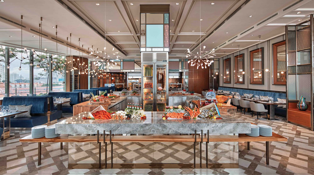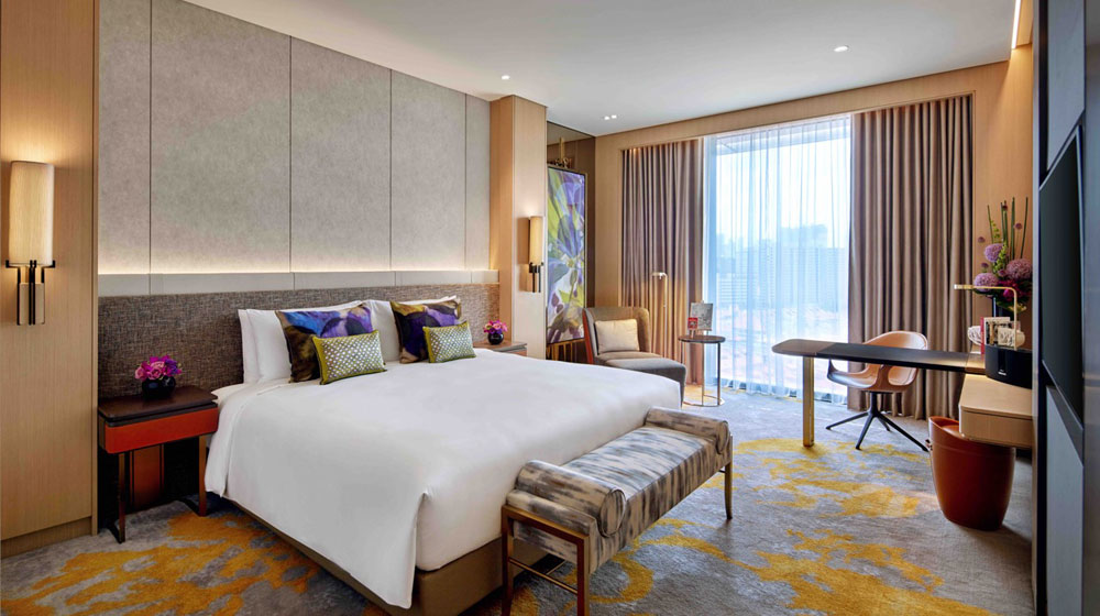 The hotel opened in October 2017 in a prime position just three-minutes’ walk from a fabulous eat-street alive with Korean, Japanese and Singaporean fare – it’s worth a wander even if you decide to eat at the on-site Racines restaurant. With executive chef Jean-Charles Dubois at the helm, French and Chinese classics are prepared at the restaurant’s four live cooking stations.