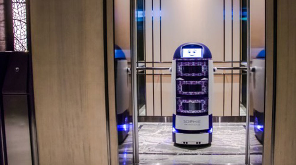 The more you look, the more you find. By the door is a bag with a yoga mat and exercise props designed to be used in the room or by the pool. And if you’d like an extra bottle of water? A robot named Sophie or Xavier will deliver it to your door!