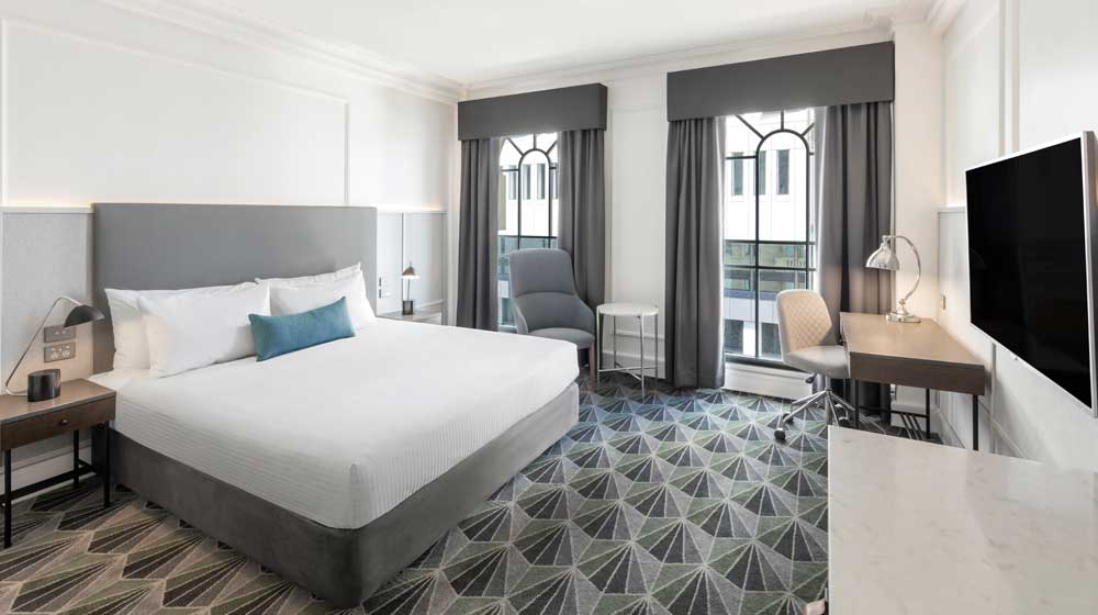 The Savoy Hotel on Little Collins has 163 guest rooms with plush furnishings in a classic palette of dove grey, blue, white and charcoal, with full-length mirrors and custom carpet featuring period motifs. Each bathroom has white subway tiles and chequerboard black-and-white tiled floors, contrasting with chrome tapware that reflect the heritage elements of the building.
