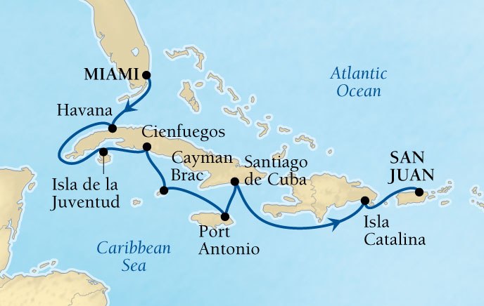 - 10 December 2019: 11-day Miami to San Juan, Puerto Rico, includes stops in Havana (La Habana), Cuba (overnight); Punta Frances, Isla de la Juventud, Cuba; Cienfuegos, Cuba; West End, Cayman Brac, Cayman Islands; Port Antonio, Jamaica; Santiago de Cuba (overnight); and Isla Catalina, Dominican Republic.