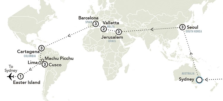 Departing from Australia (Sydney) on 30 September 2019, the itinerary will head directly to Seoul, South Korea, before heading to Jerusalem and Bethlehem, then to Malta in the Mediterranean, onward to Barcelona, and across the Atlantic to Cartagena, on the Caribbean Coast of Colombia. Next, Cusco and Machu Picchu, and finally a stop at Easter Island before returning to Sydney on 19 October. The itinerary will provide ample time to explore each location, with most stops consisting of either a two- or a three-night stay.