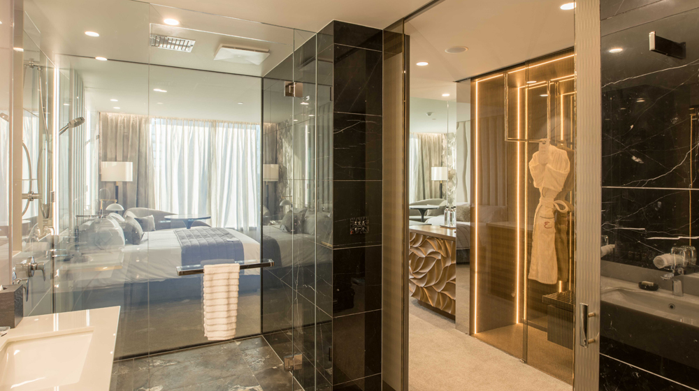 “Whether for business or leisure, our suites have been purpose-designed for indulgence and to satisfy the most discerning traveller. There is no ‘entry level’ experience here – each spacious, sumptuously appointed room features a bronze wet bar, 55-inch mirror television that doubles as functional art, Bose Sound Bar and a large, exquisitely finished ensuite with double vanities, privacy switch glass and premium bathing amenities. An extended mini-bar offering, including a Eurocave eight-bottle wine fridge stocked with premium local and international drops, and 24-hour in-suite dining menu, heightens the luxury experience.”