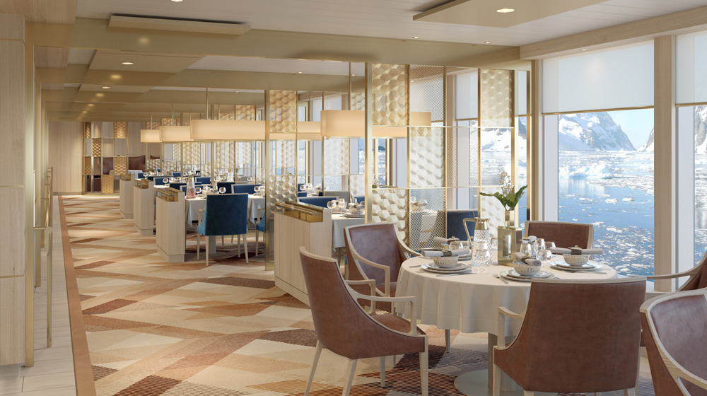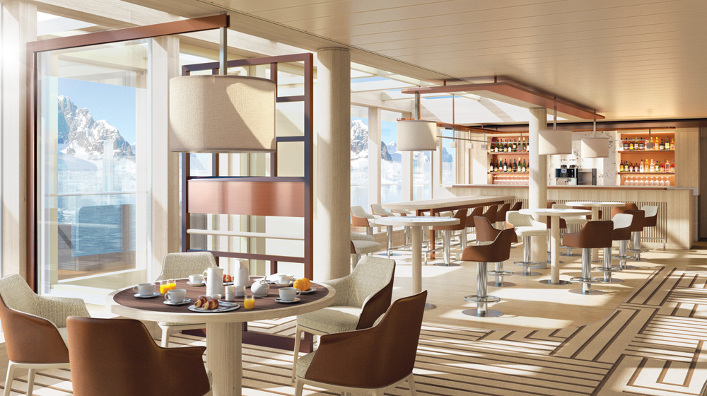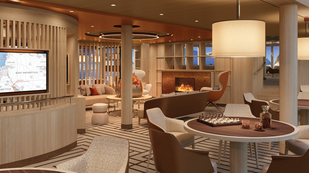 Fire and ice are twin themes throughout the ship, in the colour schemes and the feelings engendered by her spaces: from the ‘chill’ cool of the Ice Lounge, the expedition community hub for recap, talks, presentations and sociability, with a B&H Photo Gear Locker for trying new tech, to the conversation-kindling warmth around the fireplace of The Den on the Observation Deck. Travellers can discover spa treatments and therapies at The Sanctuary, and enjoy twin infinity Jacuzzis as well as saunas with million-dollar views. A glass-walled yoga studio will transform the polar experience.
