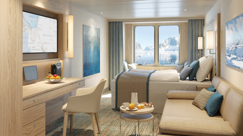 Elegantly imagined, with a sense of limitless space effortlessly incorporated into the design, the 13 extra-large balcony suites – each named for a famous polar explorer – impart a feeling of serenity. Palettes of warm creams, oatmeal and coral are complemented by soft textures, round corners, art that invites the eye to linger and Lindblad’s signature feather duvets; a walk-in wardrobe and roomy, stone-clad bath make each suite a haven.