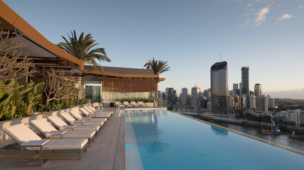 The 23-metre rooftop infinity pool boasts views of the CBD