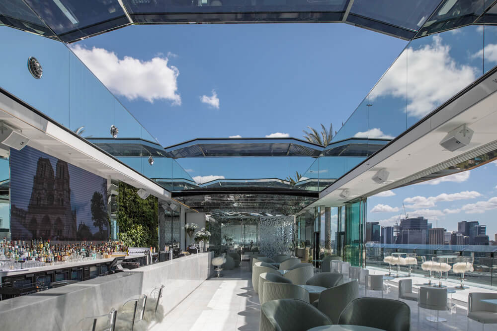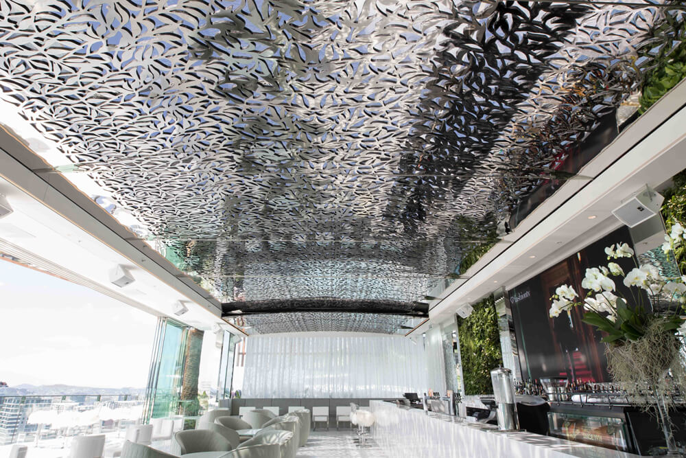 The evening continued with cocktails at The Terrace, a versatile space on the hotel’s 21st floor. A light colour palette and polished surfaces complement the living ‘green walls’, backlit floor tiles and the 13-metre-long white onyx bar. Two retractable roofs offer full (as faceted glass for a gem-like effect), partial (as cut-out frangipanis for a dappled effect) or no exposure to the elements.