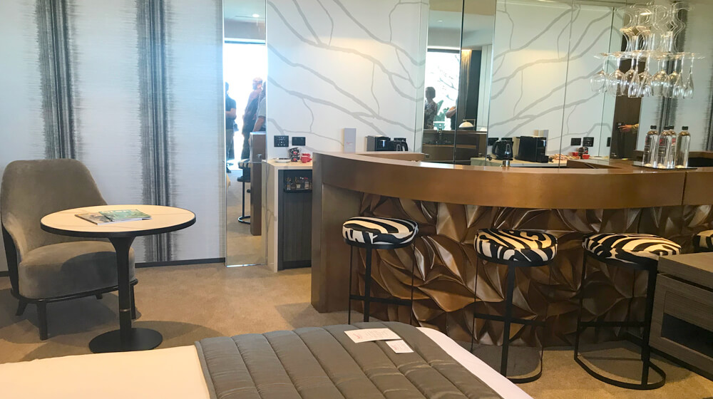 During a tour of the 143-suite hotel, guests explored the 23-metre rooftop infinity pool, state-of-the-art meeting rooms and the grand, pillar-less Frangipani Ballroom, adorned with its namesake flower. It was also an opportunity to appreciate the level of detail that Anthony and Francine John have lavished on their hotel, from the zebra-print ironing board covers to the in-room Eurocave eight-bottle wine fridges, from the bronze wet bars in all suites to the privacy switch glass in the bathrooms, and from the impressive 55-inch mirrors that double as TVs to the Maserati Levante transfers for VIPs.
