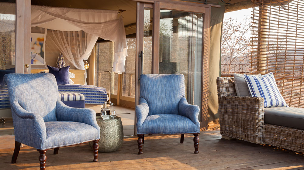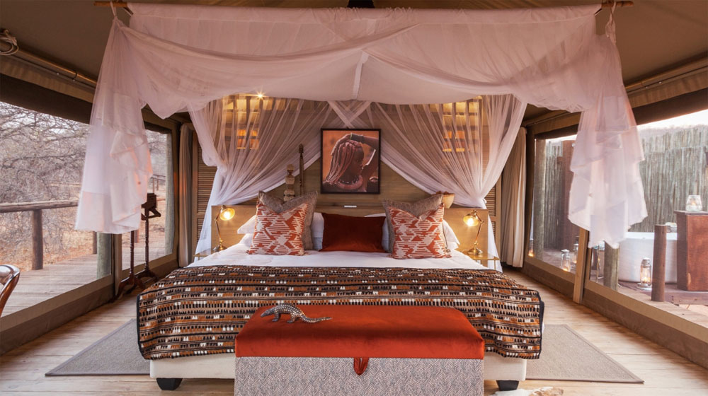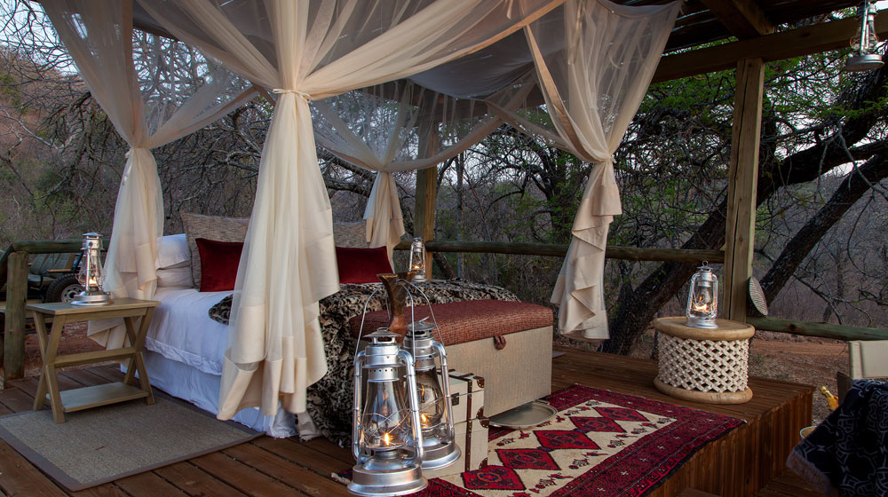 Raised above the surrounding bushveld on sprawling wooden decks, the eco-friendly lodge presents a sustainable wilderness and safari experience in the lap of luxury. Those with an adventurous spirit have the option to upgrade their luxury tent to a romantic sleep-out experience under the African skies on a comfortably furnished, raised wooden deck in a remote part of the reserve. With little more than candlelight and the sounds of nature all around, this is an unforgettable primal experience, bringing luxury as close to nature as can be imagined.