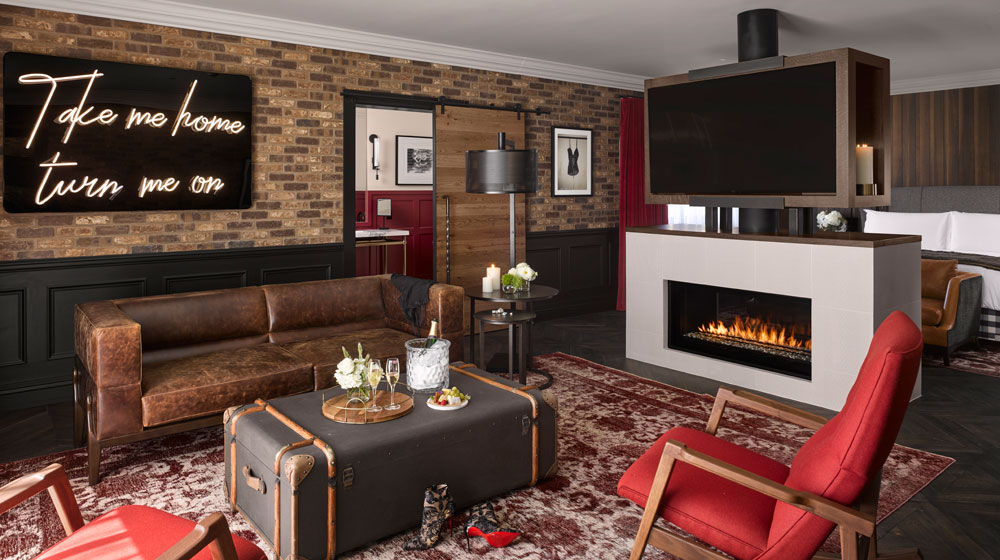 tub area. The shared gathering space has a living room and entertaining area as well as a Chef’s kitchen
