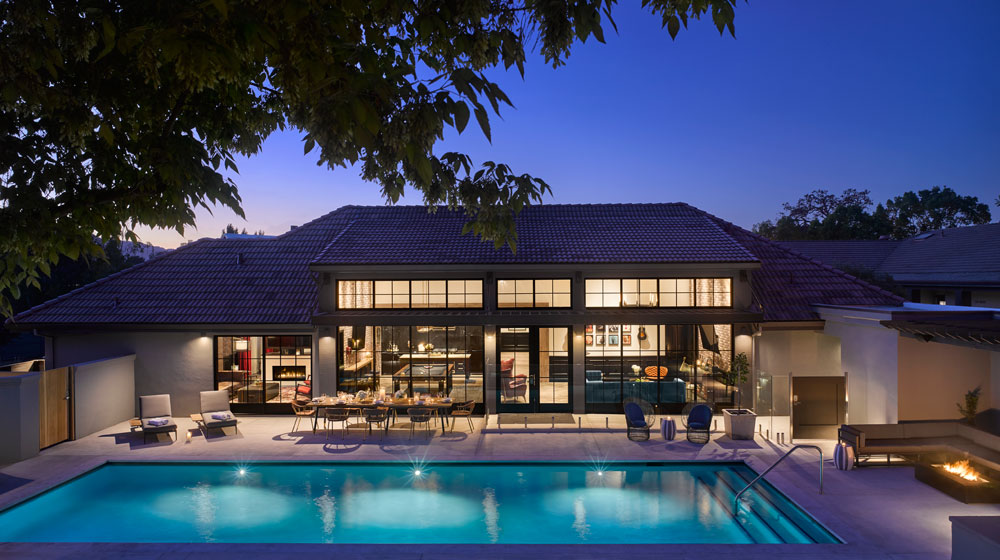Soaring ceilings flanked by endless walls of windows overlook the secluded pool and private hot