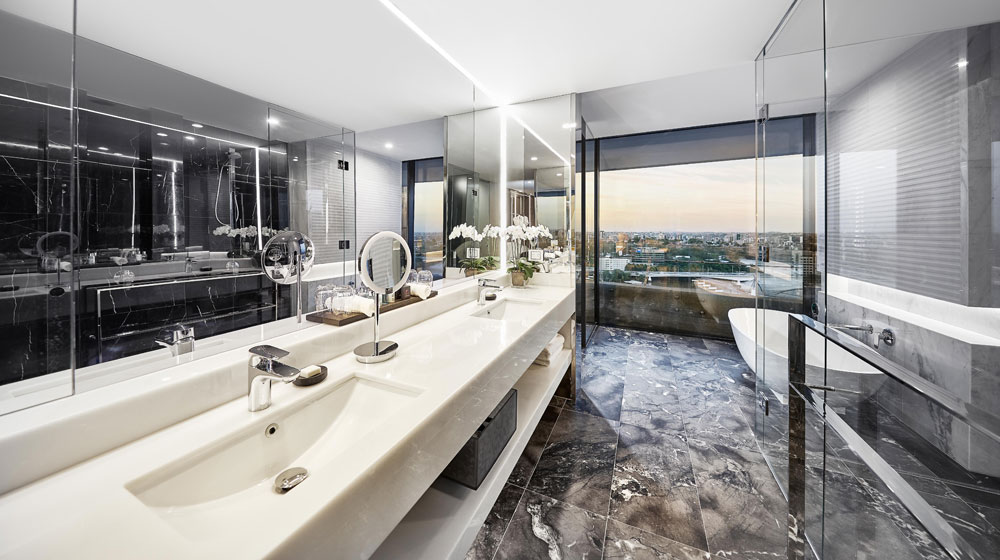 Located on the hotel’s 20th floor, the Frangipani Suite provides a superlative experience for the luxury traveller with a range of contemporary touches. A formal double entry with marble flooring leads to an elegant living room with baby grand piano, double-sided fireplace, a handmade bronze bar with seating for three people and a private balcony, with seating offering uninterrupted views of the Brisbane River and city skyline.