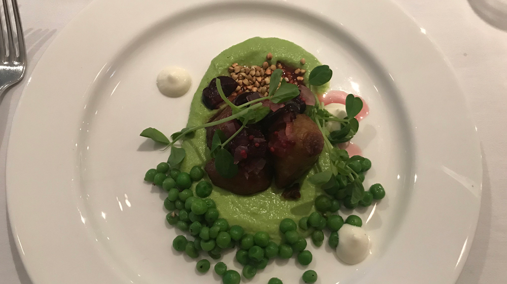 Entrée of Jerusalem artichoke, peas and cherries