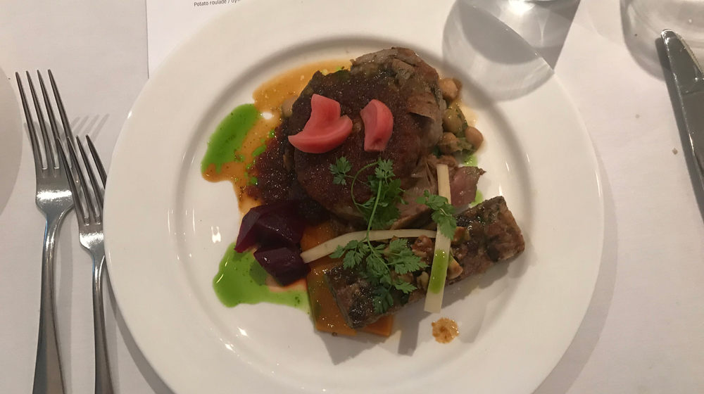 Main of Australian slow-roasted leg of lamb with preserved lemon, accompanied by German pretzel dumplings and German pickles