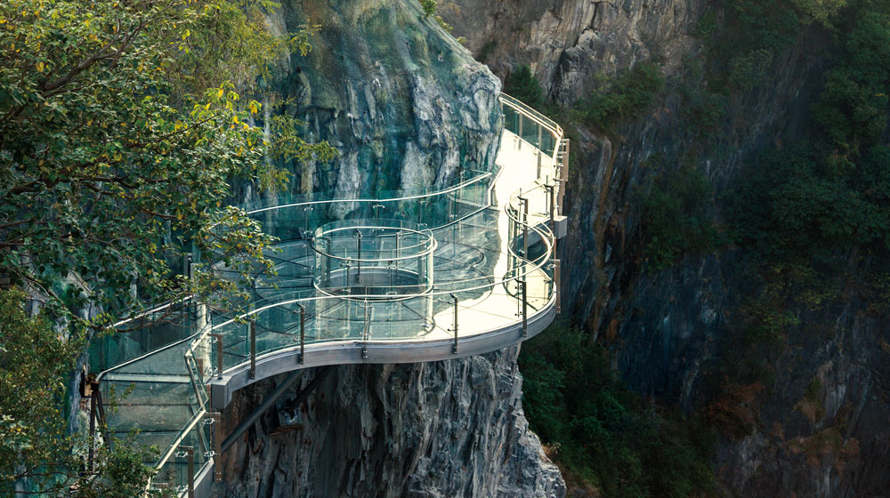 Guests can partake in extreme challenges such as rock climbing, kayaking and the property’s glass-floored skywalk. Evenings are lit up by a night-time laser and water-screen show.