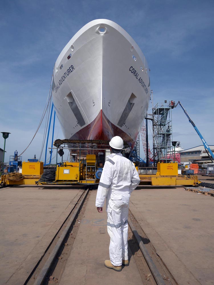 The float-out ceremony at the Vard Shipyard in Vietnam, which involved two days of relocating the vessel from yard onto the floating dock, was a key milestone for Australia’s pioneering cruise line, Coral Expeditions.