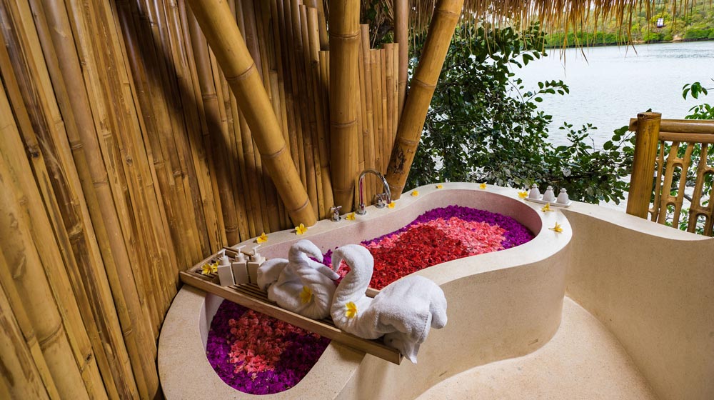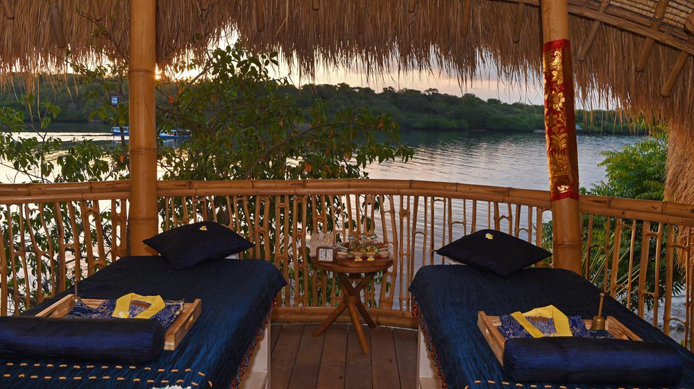The Spa Tent houses one single and two double treatment rooms divided by curtains, as well as a bathroom with a private semi-open-air bathtub. Suspended on the edge of the cliff overhanging the water, each of the two self-contained Spa Pods is a dreamy pavilion, fashioned in sustainable bamboo and capped with an ‘alang-alang’ grass roof. Designed for couples, each is equipped with two massage beds, a rain shower and a romantic soaking tub for two. The pods are completely private, yet open on the seaward side of the cliff to the beautiful Banyuwedang Bay with Java’s Mt Raung towering in the distance.