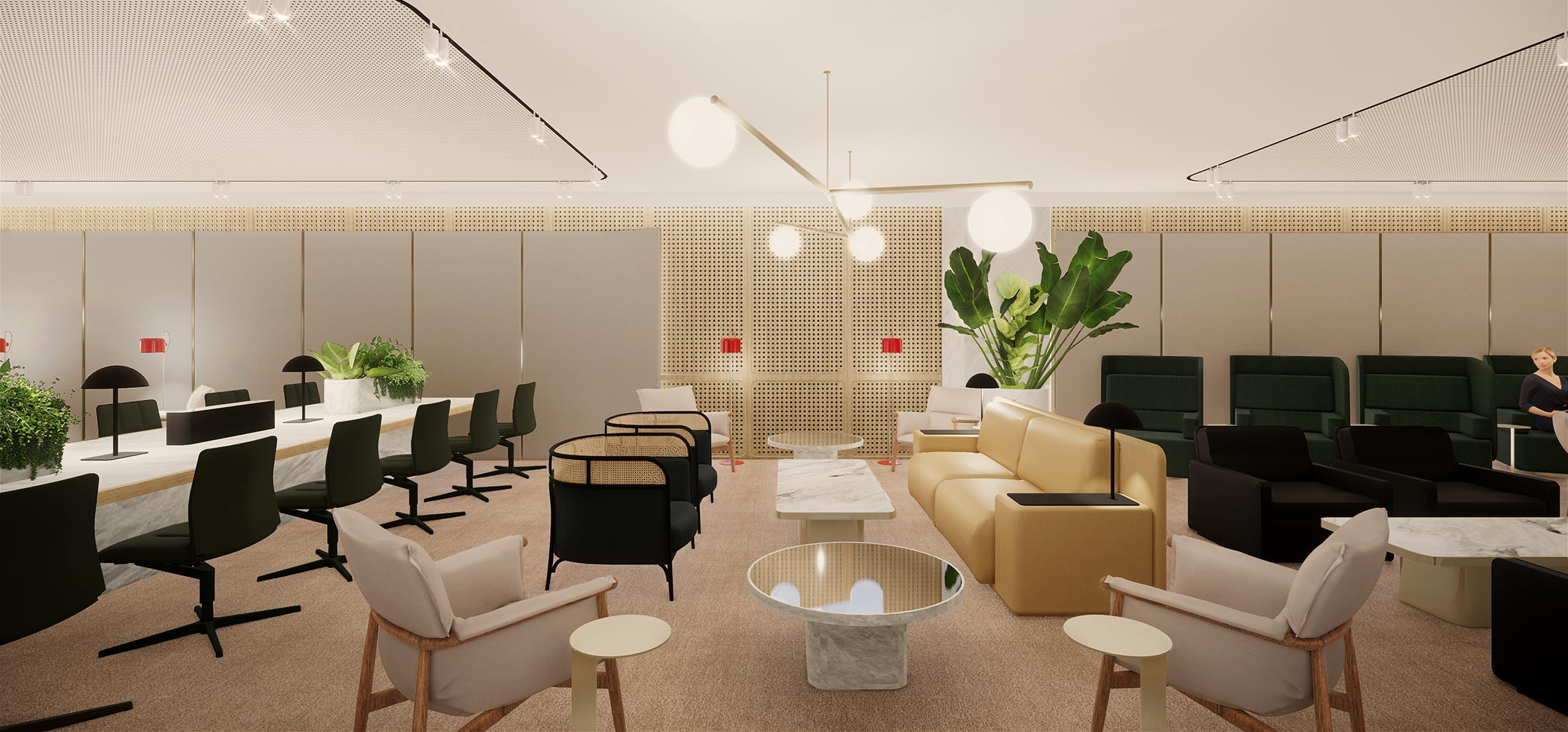 Unveiling detail of the interiors today, designer David Caon said a neutral colour palette, luxurious materials and leafy green highlights will make customers feel relaxed as soon as they enter the lounge.