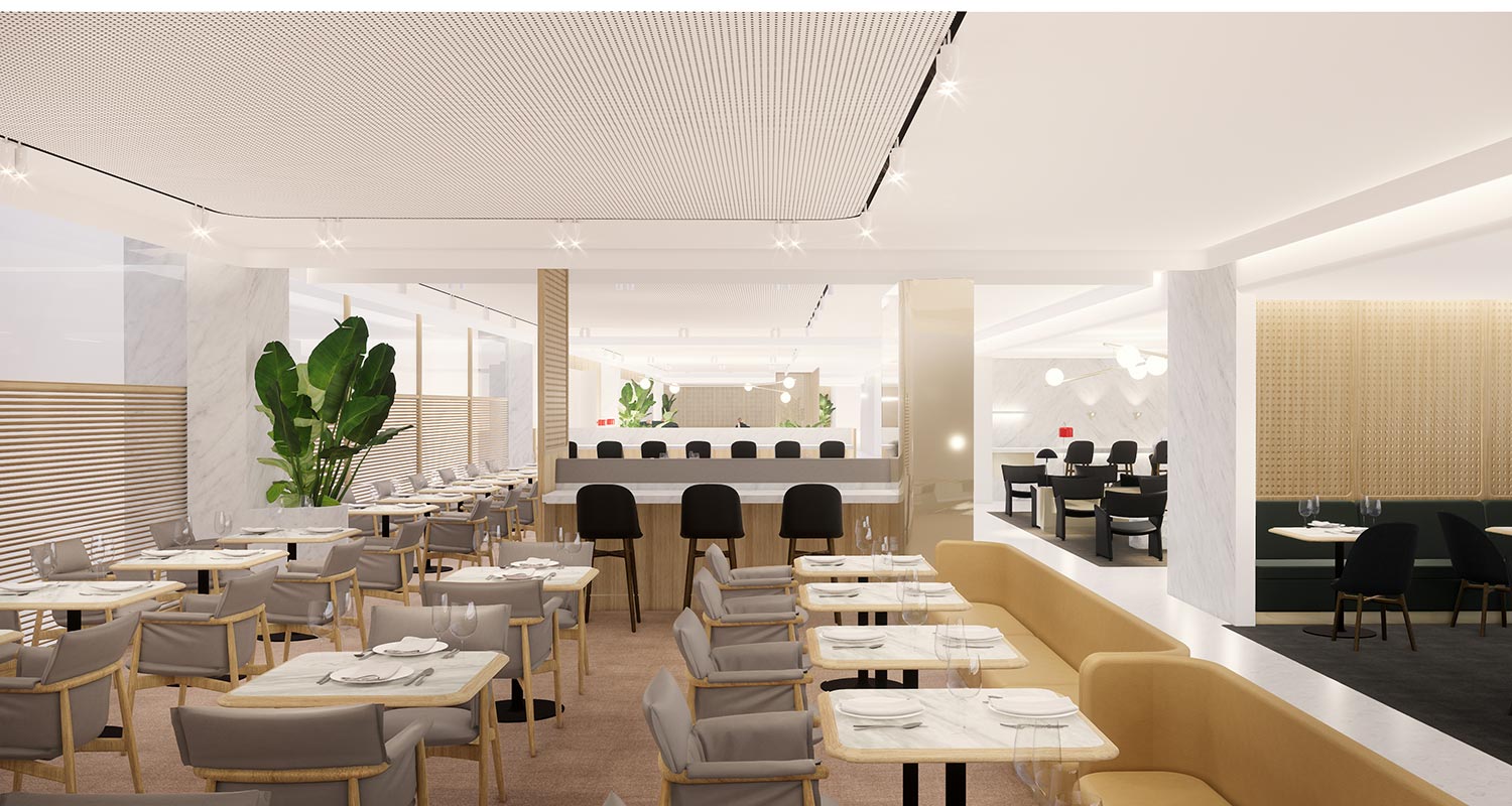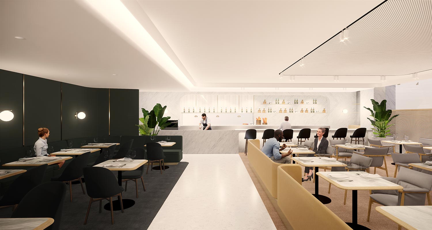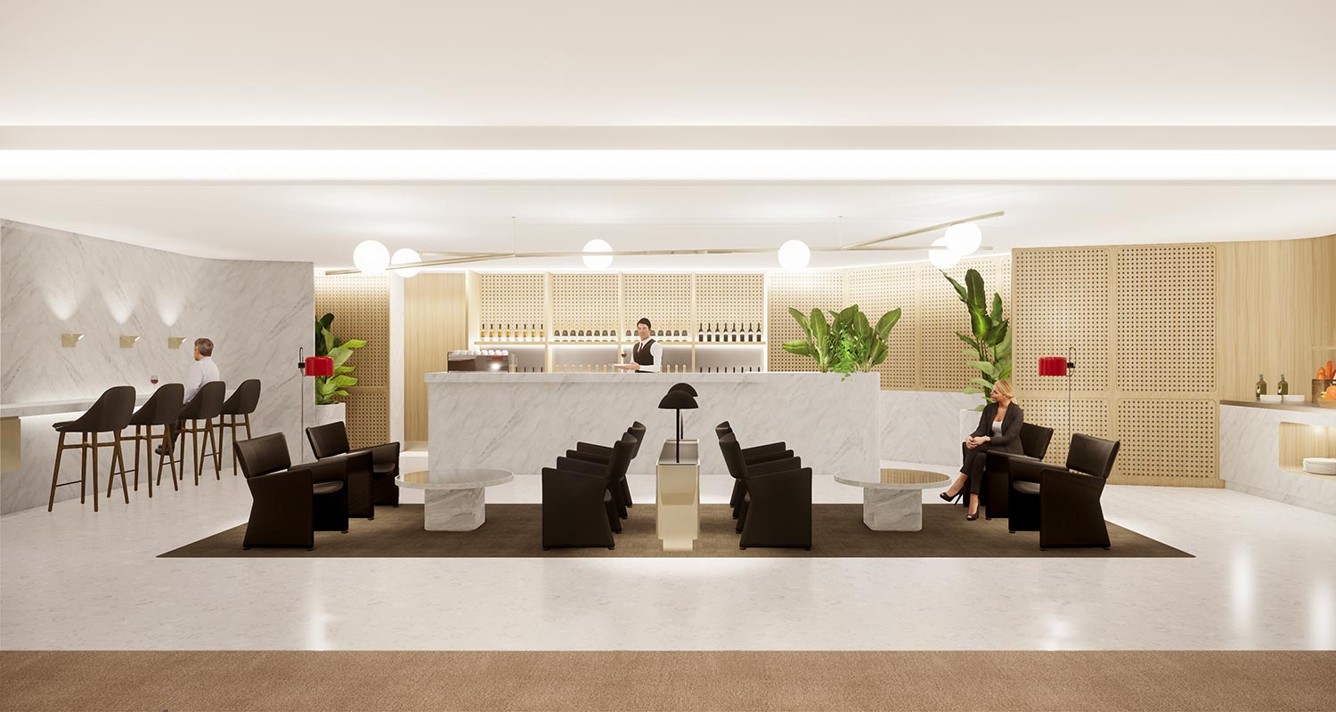 Unveiling detail of the interiors today, designer David Caon said a neutral colour palette, luxurious materials and leafy green highlights will make customers feel relaxed as soon as they enter the lounge.