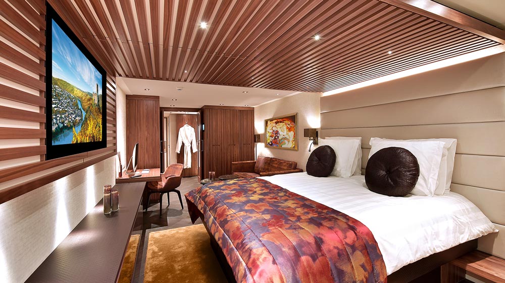 The ship’s size also allows for grand public spaces and amenities, including: five bars; four unique dining venues (the Main Restaurant, Chef’s Table, Jimmy’s Wine Bar Restaurant and the Al Fresco Restaurant); two massage rooms in the Zen Wellness Studio; a pop-up elevator to the Sun Deck for accessibility to all levels; and the only Water Sports Platform on the river.