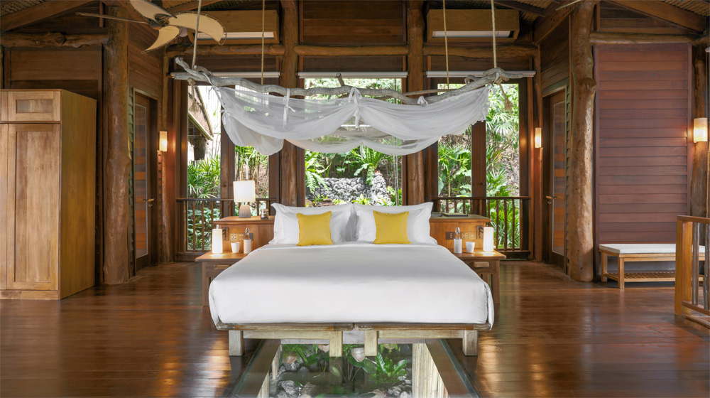 Stepping into the villa, guests feel in harmony with nature due to Thai-inspired interiors, infused with a contemporary twist. A newly added waterfall is visible through a glass floor in the bedroom as it flows beneath the king-size bed, connecting the occupants with the soothing sight and sounds of flowing water.