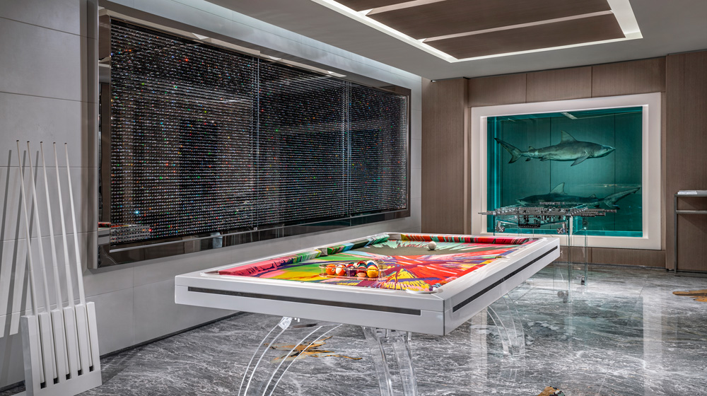 Designed in collaboration with award-winning firm Bentel & Bentel, Hirst’s personal touch appears in nearly every aspect of the villa: from specially designed furniture and textiles that incorporate Hirst’s signature spin designs, butterfly and pharmacy motifs, to large-scale works of art, including a large pill cabinet filled with diamonds.