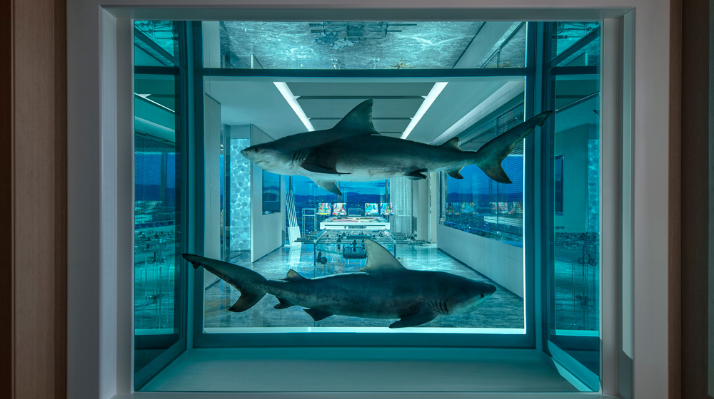 In addition to Hirst’s bespoke furniture, six original works are showcased in the Sky Villa, including Winner/Loser (2018), two bull sharks suspended in formaldehyde in a white tank set into the wall of the suite; Casino Royal (2018), a ten-panel collection of his butterfly motifs on monochrome gloss-painted canvases, a Medicine Cabinet called Vegas (2018), The Winner Takes It All (2018), and Money (2018).