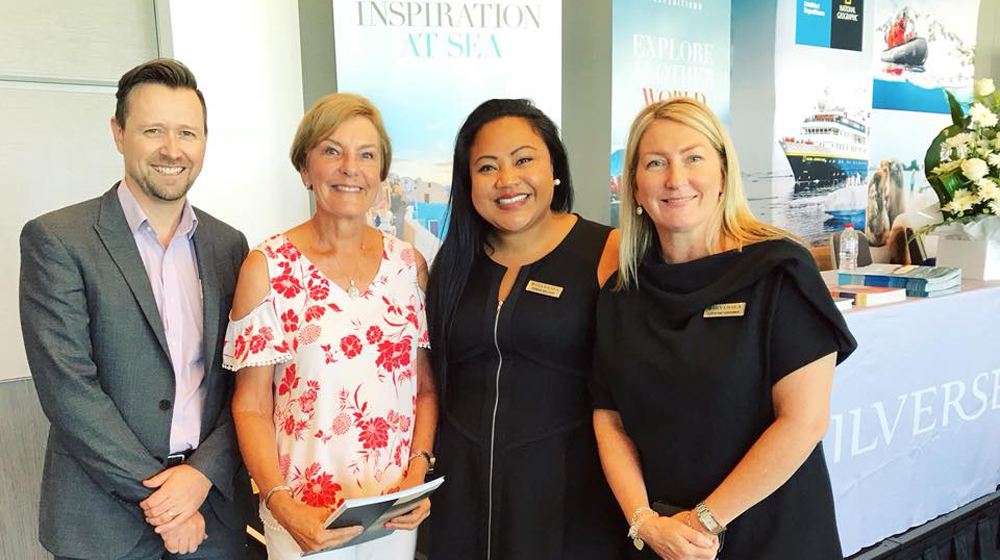 Lead image: Andrew Boyce with Lynette, winner of the $2000 Silversea cruise credit; Rebeka Belcher BDM, WA for Silversea and Christine Gardiner, BDM for Silversea Expeditions.