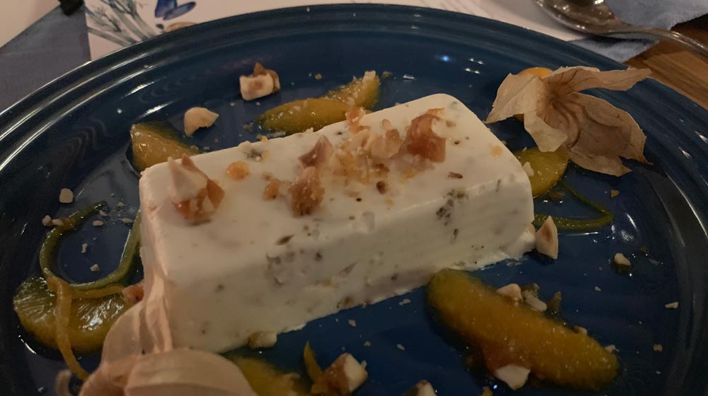 Iced nougat with frozen caramalised nut parfait with citrus compote