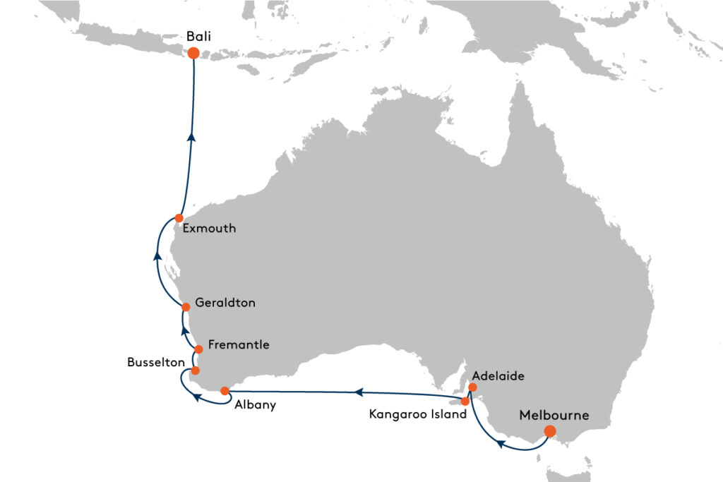 On this maiden route, guests can look forward to sandboarding in the desert, seeing giant red tingle trees in the Valley of the Giants and experience encounters with dolphins, emus and koalas. The cruise starts in Melbourne, a city considered one of the most liveable in the world. From there, guests will cruise to the coastal city of Adelaide and then visit Kangaroo Island and Albany, Australia’s oldest town. Next up is Busselton in the famous Margaret River wine region, followed by Fremantle (Perth), Geraldton and Exmouth. After several days of relaxation at sea, the cruise will end on Bali, the “island of the gods”.