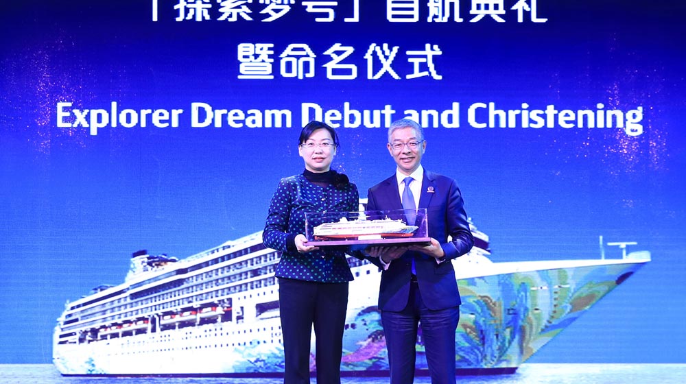 Mr. Kent Zhu, President of Genting Cruise Lines presented the scale model of Explorer Dream to Ms. Jin Yanhua, Deputy General Manager of Wu-songkou International Cruise Terminal