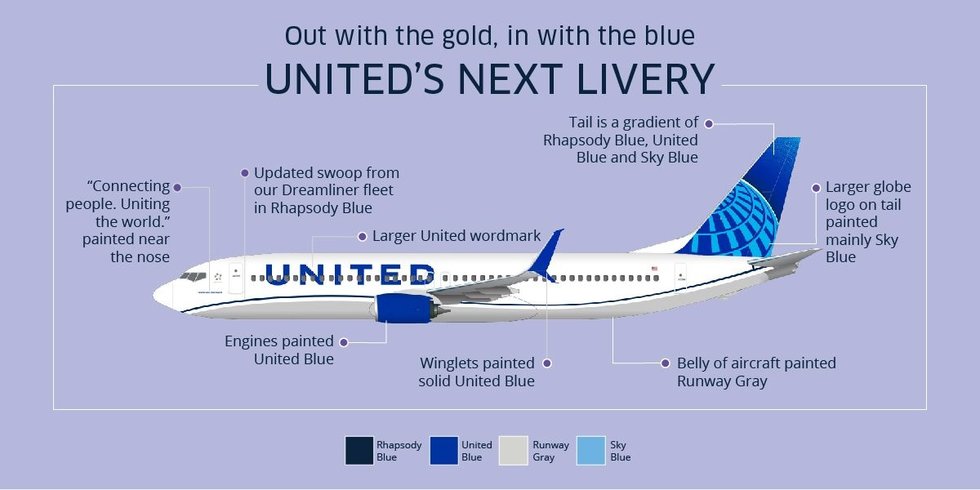 Engines and wingtips are also being painted United Blue, United’s name will appear larger on the aircraft body and the lower half of the body will be painted Runway Gray.